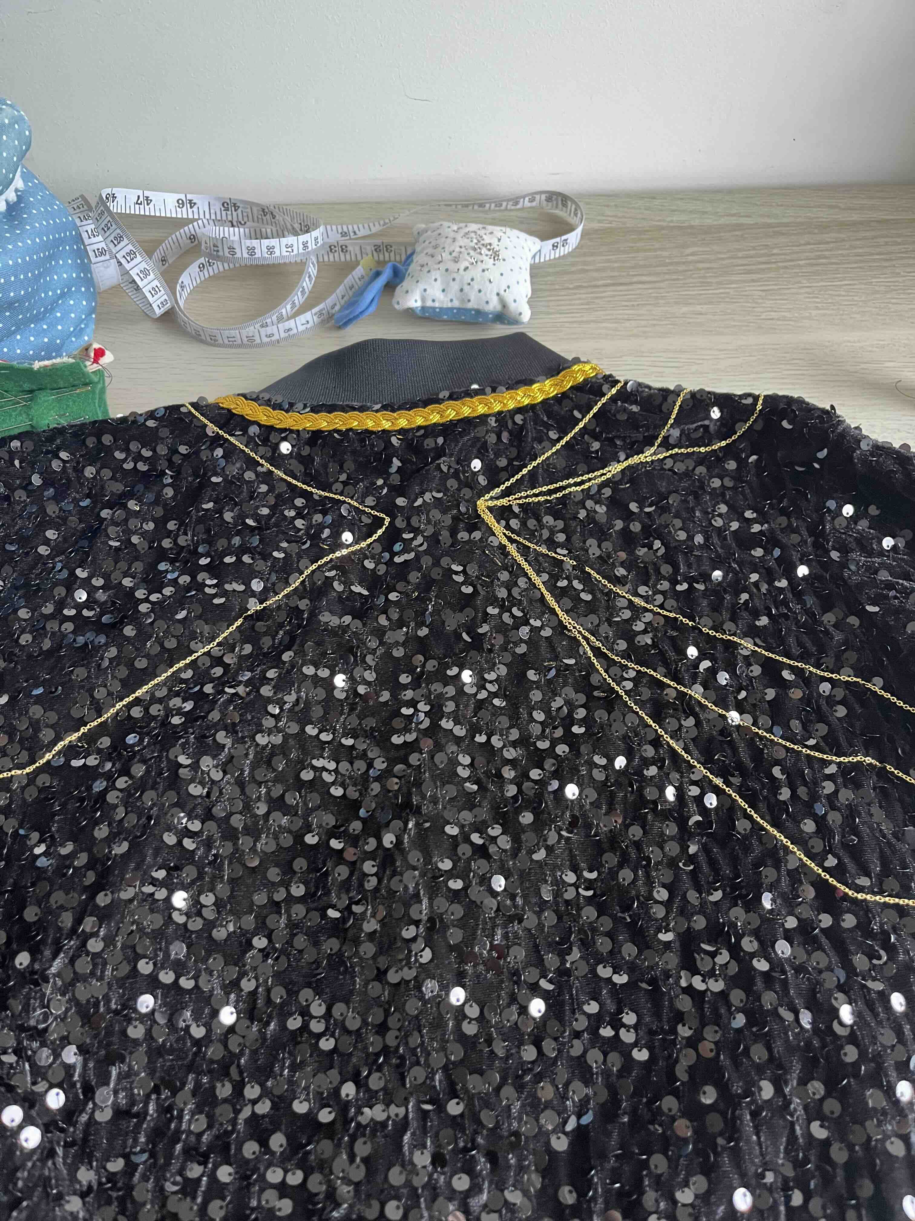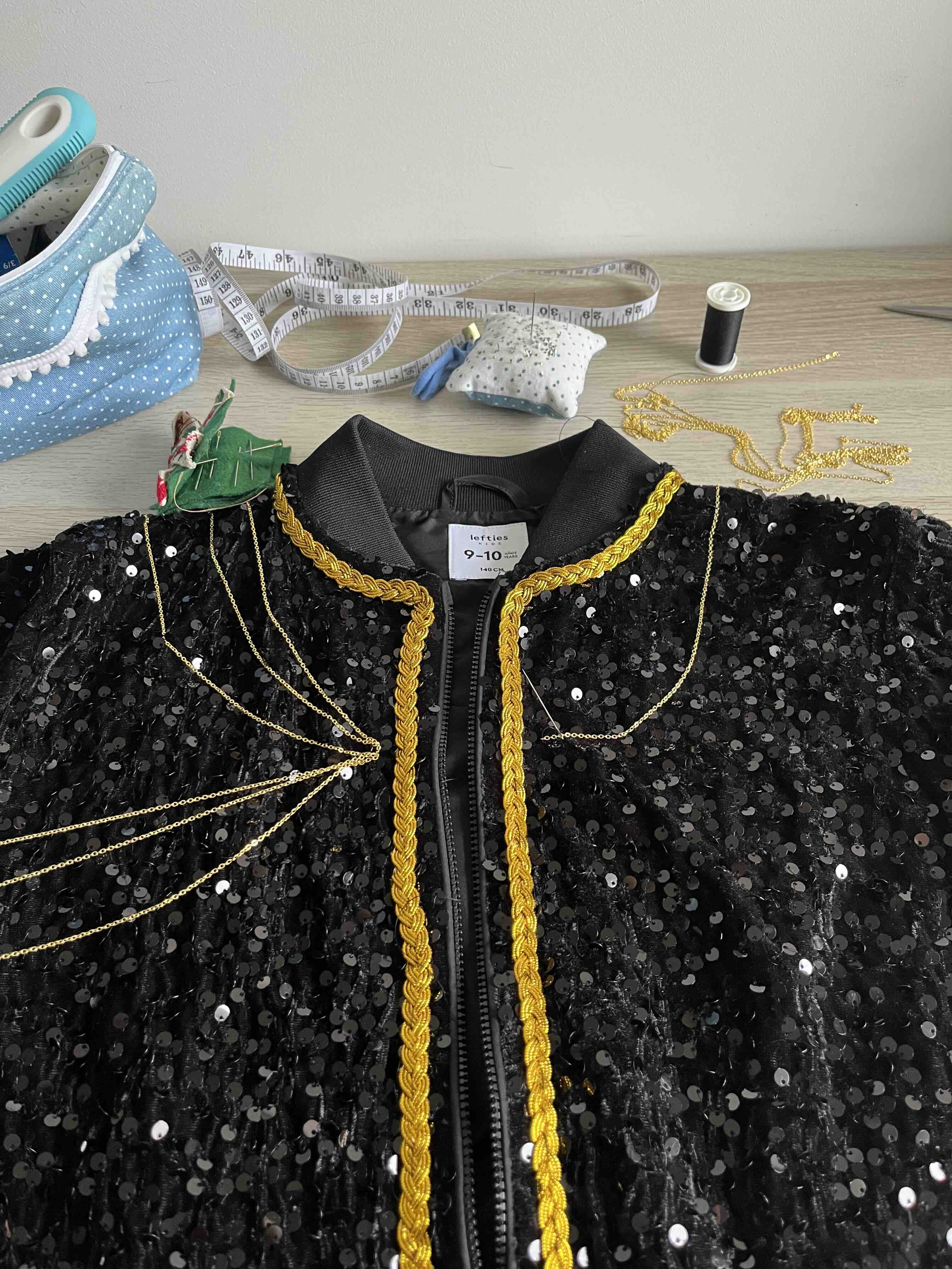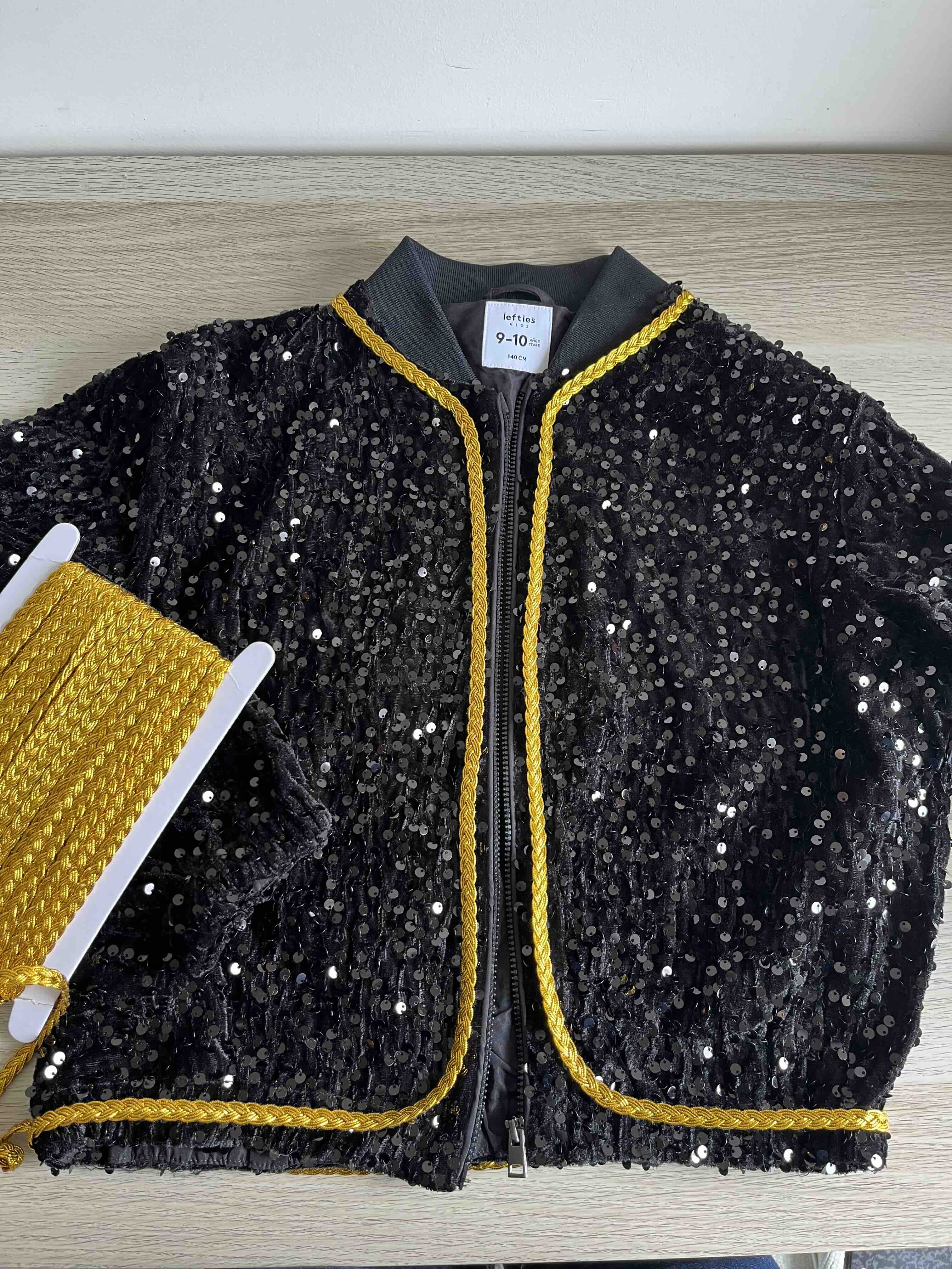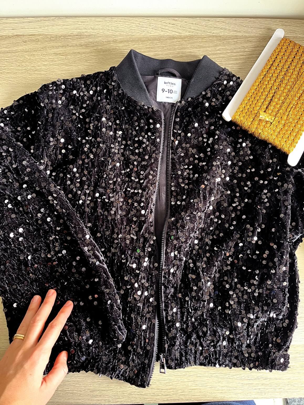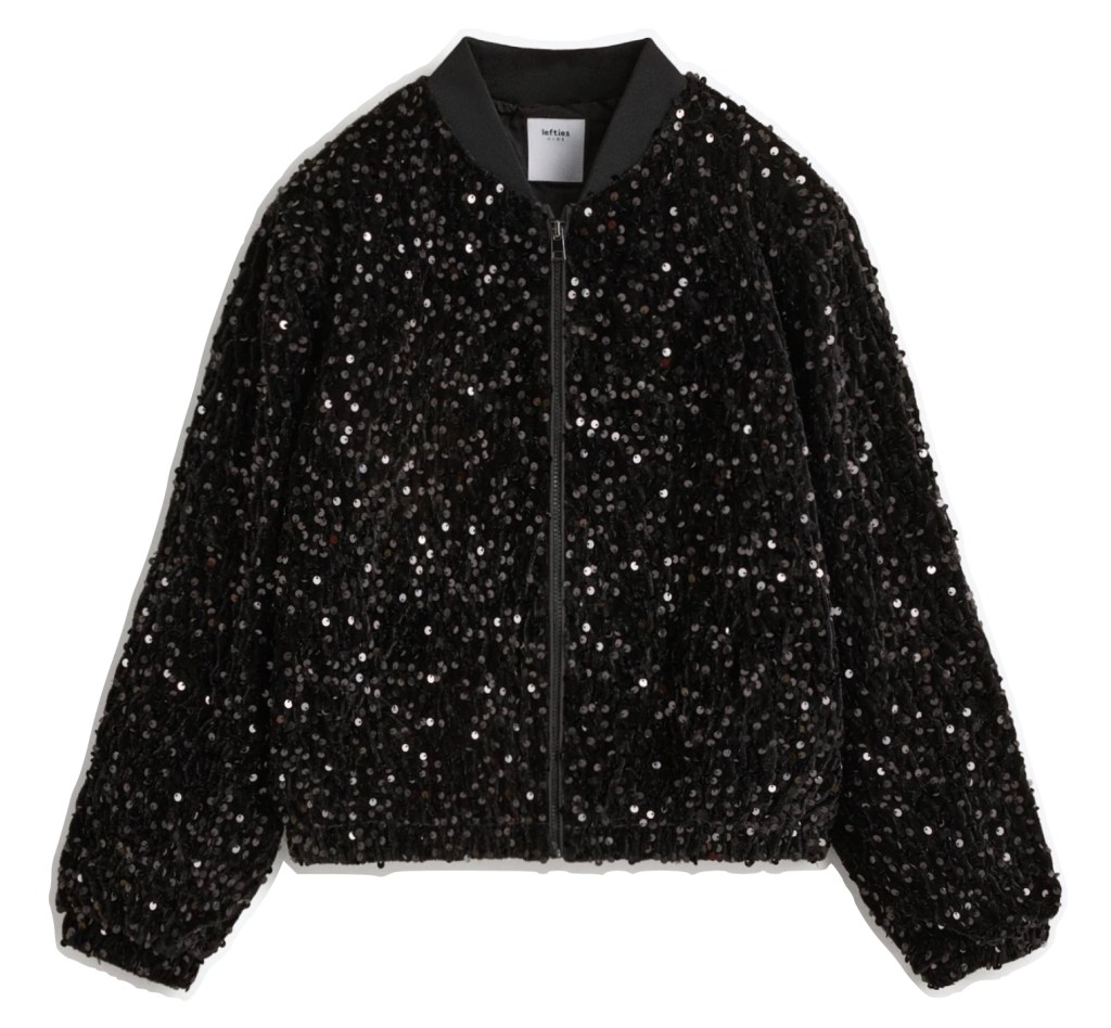 - Para o casaco de lantejoulas pesquisei por “bomber jacket lantejoulas pretas criança”.