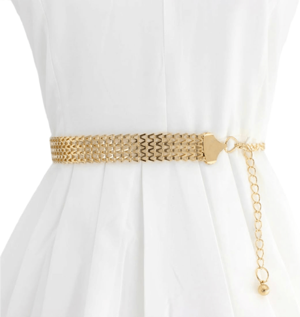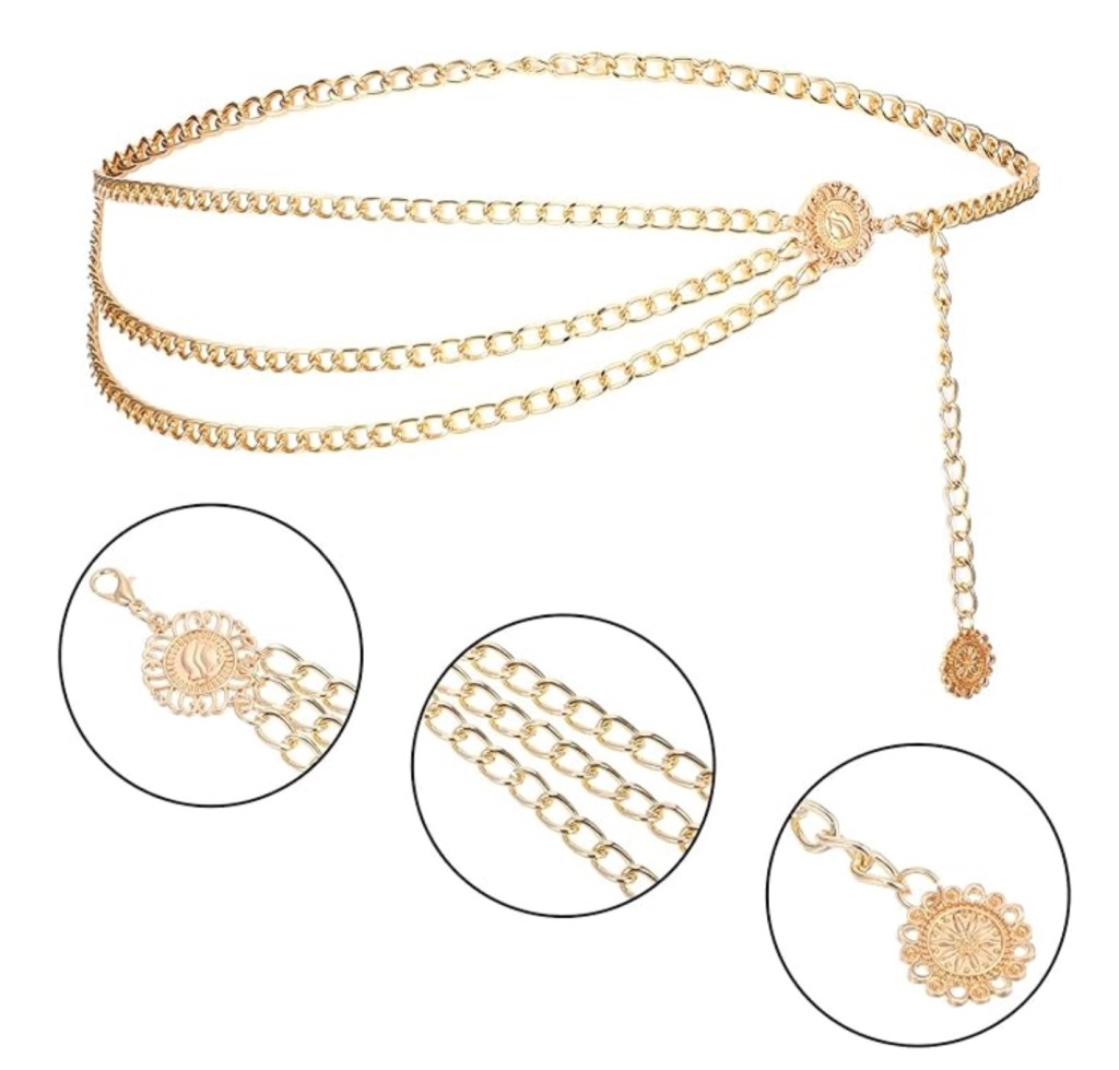 - Cosi uma ponta da corrente na frente junto ao fecho, e fui andando à volta: cosi no ombro, depois no cimo/centro das costas, depois debaixo do braço, e de volta ao início. Dei a volta 3 vezes.