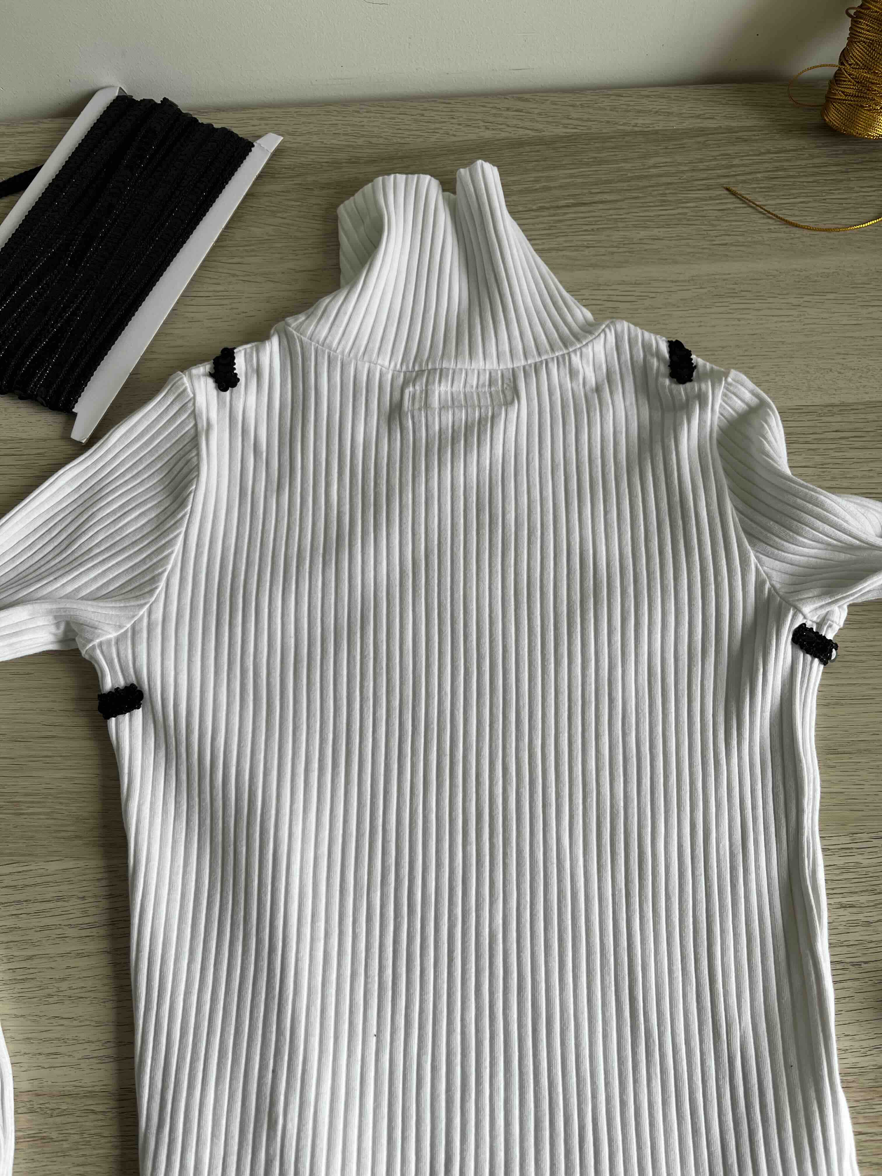 - Comecei e acabei na lateral por baixo de uma das mangas para não se notar. Pus um pouco de fita cola na ponta final para não desfiar.