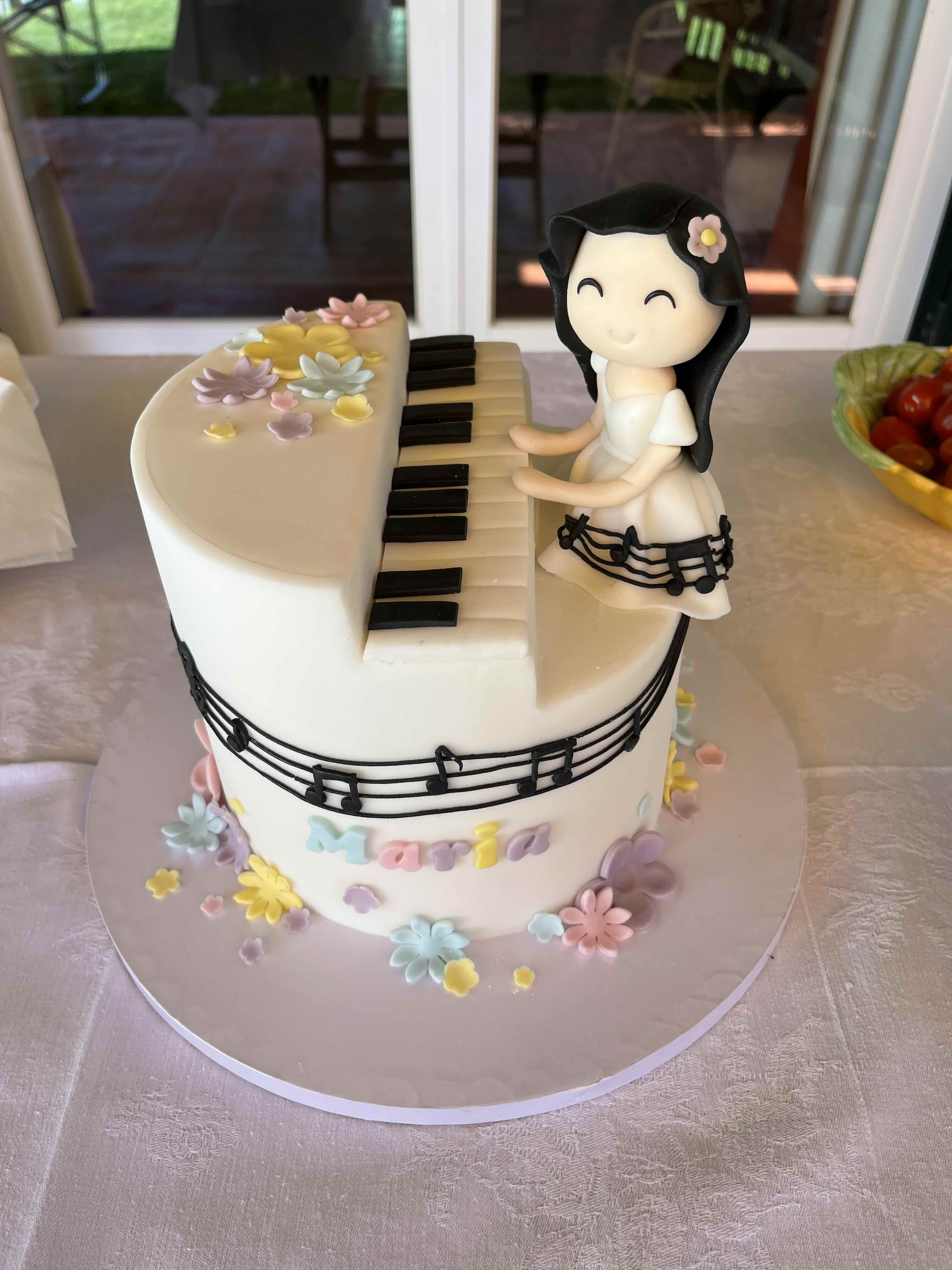 Vimos no Pinterest bolos relacionados com música: uns com notas musicais, outros com um piano e um com uma boneca a tocar piano. Era esse! Mas diferente.. então fomos pedindo alterações ao ChatGPT que ia gerando imagens até chegarmos à versão que a cliente, muito entusiasmada, aceitou.