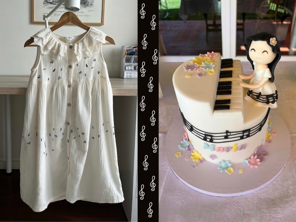Para a nossa boneca que sonha com os seus anos desde que acaba o Natal e que tem sempre ideias do que gostava, desta vez pediu um vestido de música e um bolo de música. O vestido foi uma experiência de bordado, o bolo o único DIY foram as interações com o ChatGPT, depois foi feito por quem sabe.