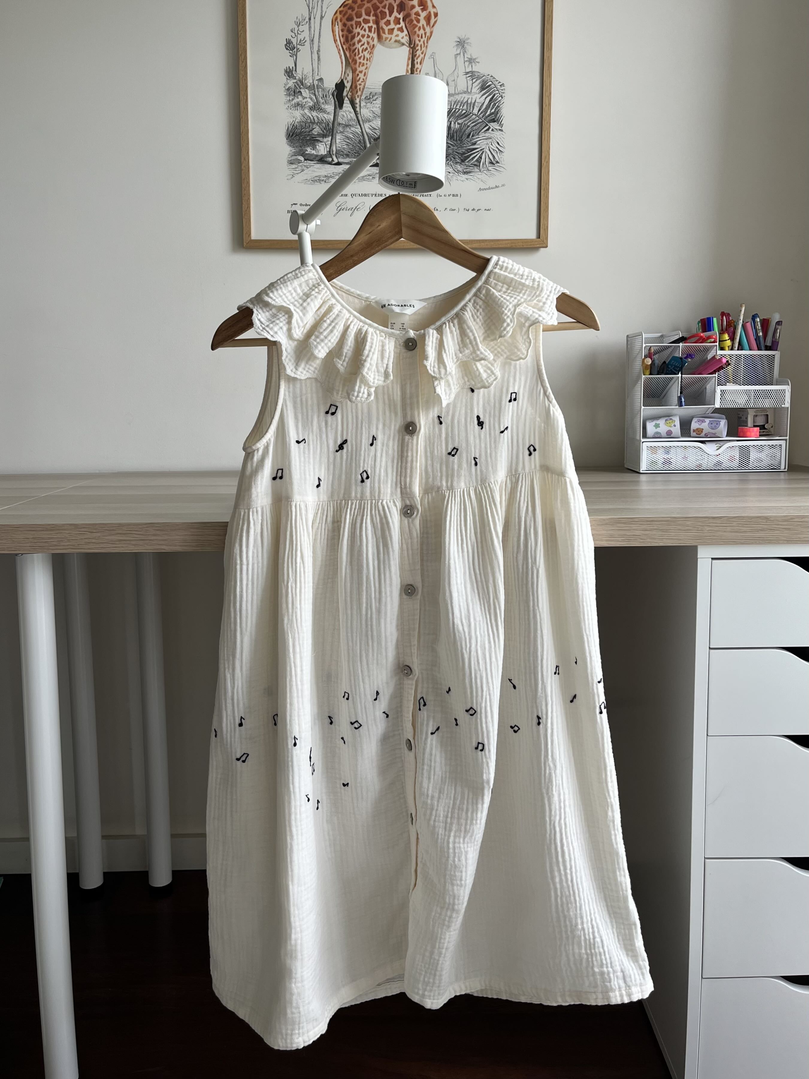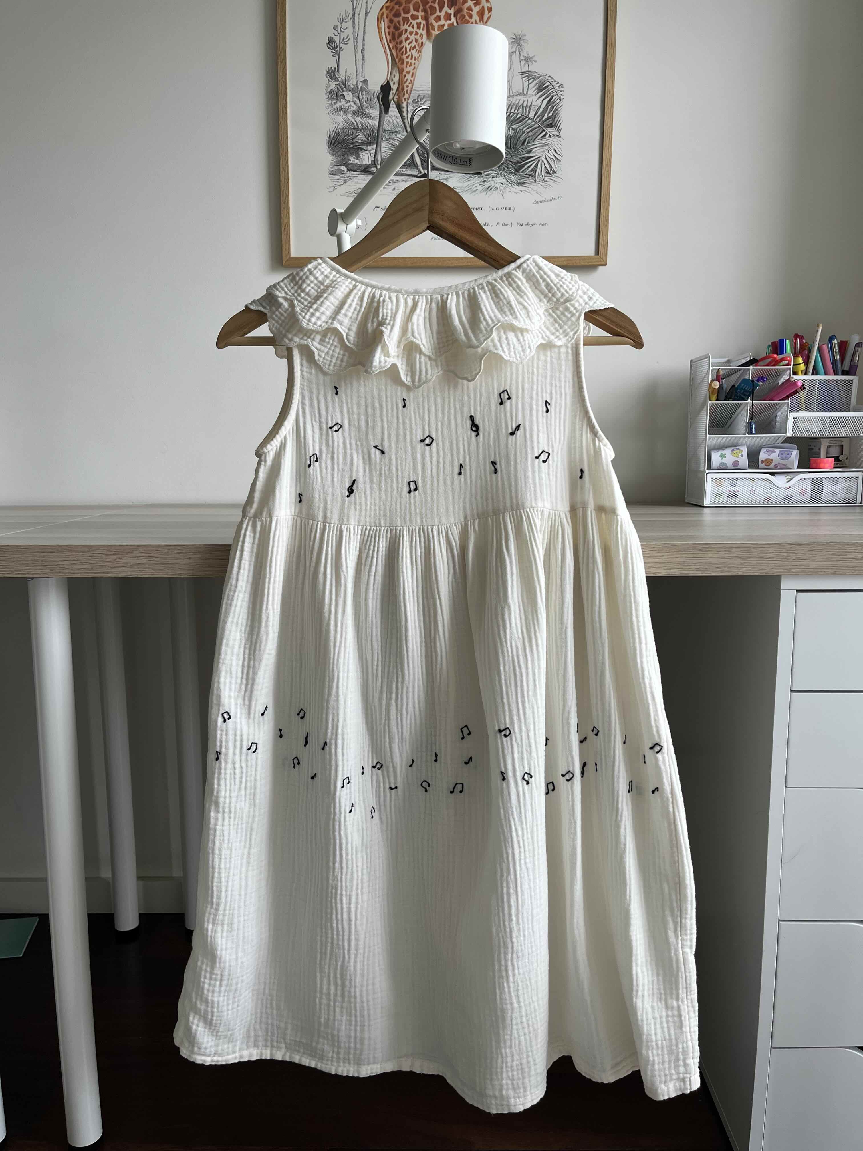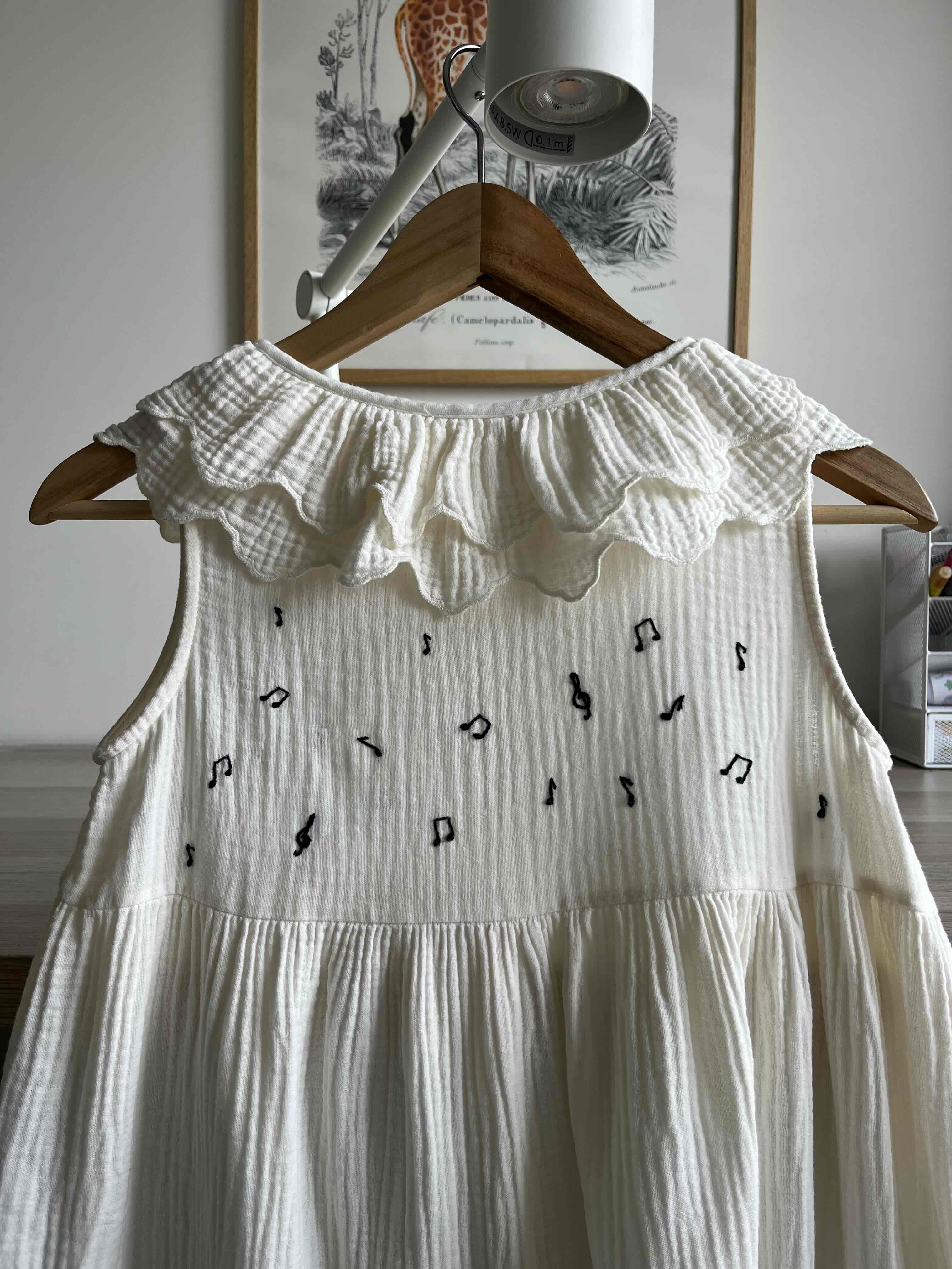 Tinha gostado mais se o vestido tivesse a gola menos desgolada. E se tivesse conseguido fazer notas em todo o vestido. Mas foi o que deu e ela adorou receber o seu vestido de música na manhã do dia de anos.