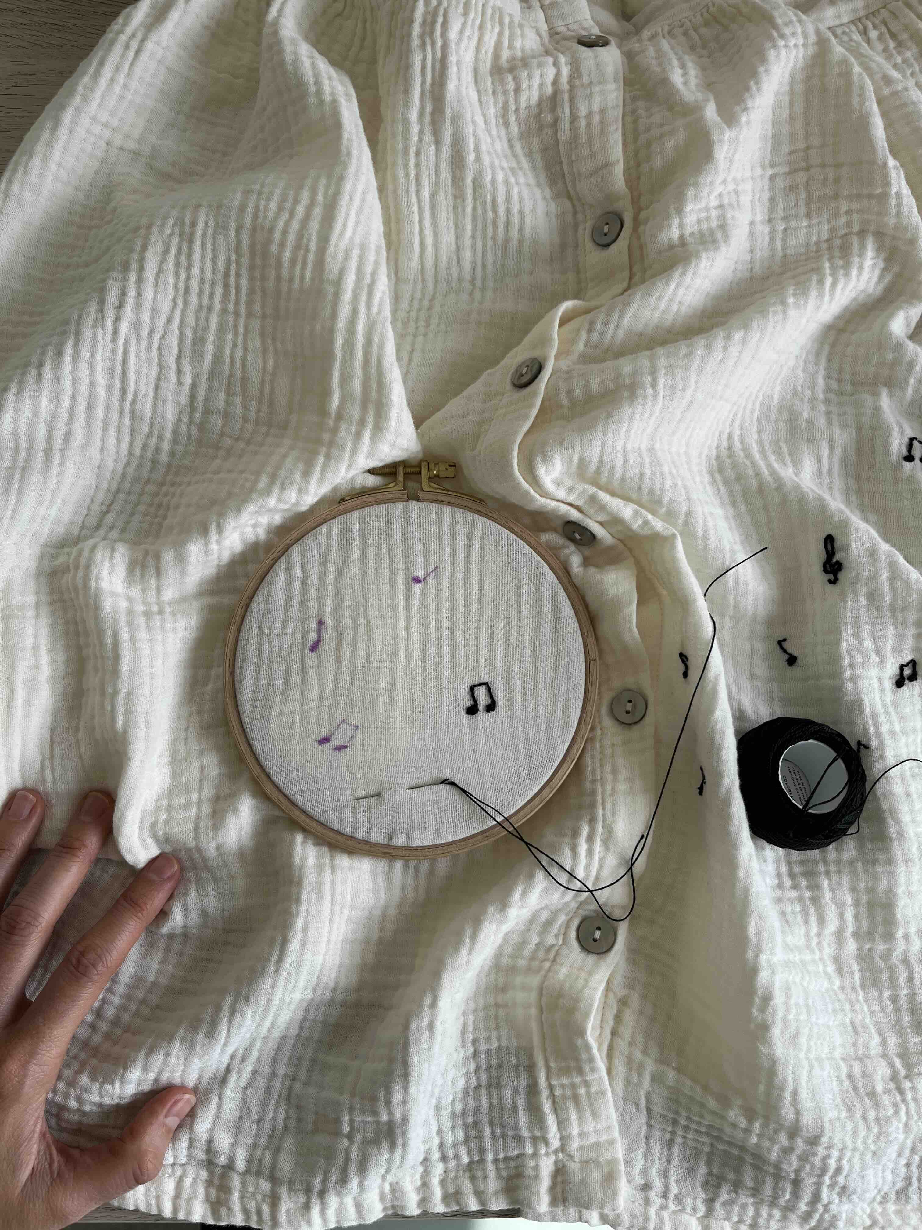Comecei a bordar, achando que ia fazer notas musicais no vestido todo…